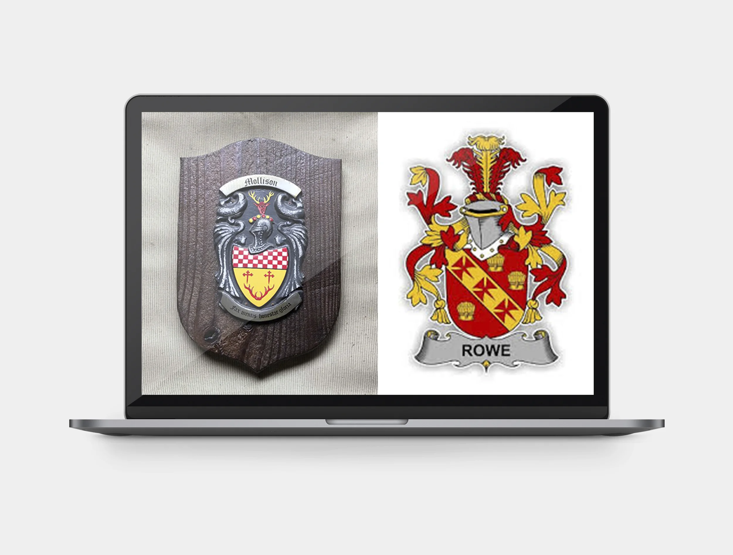 The piece was to include the family names at the top “Rowe/Mollison” and a combined quote of both family mottos “Innocens Non Timidus Fax Mentis Honestae Gloria” (“From whence we came, Glory is the torch that leads on the honorable mind).